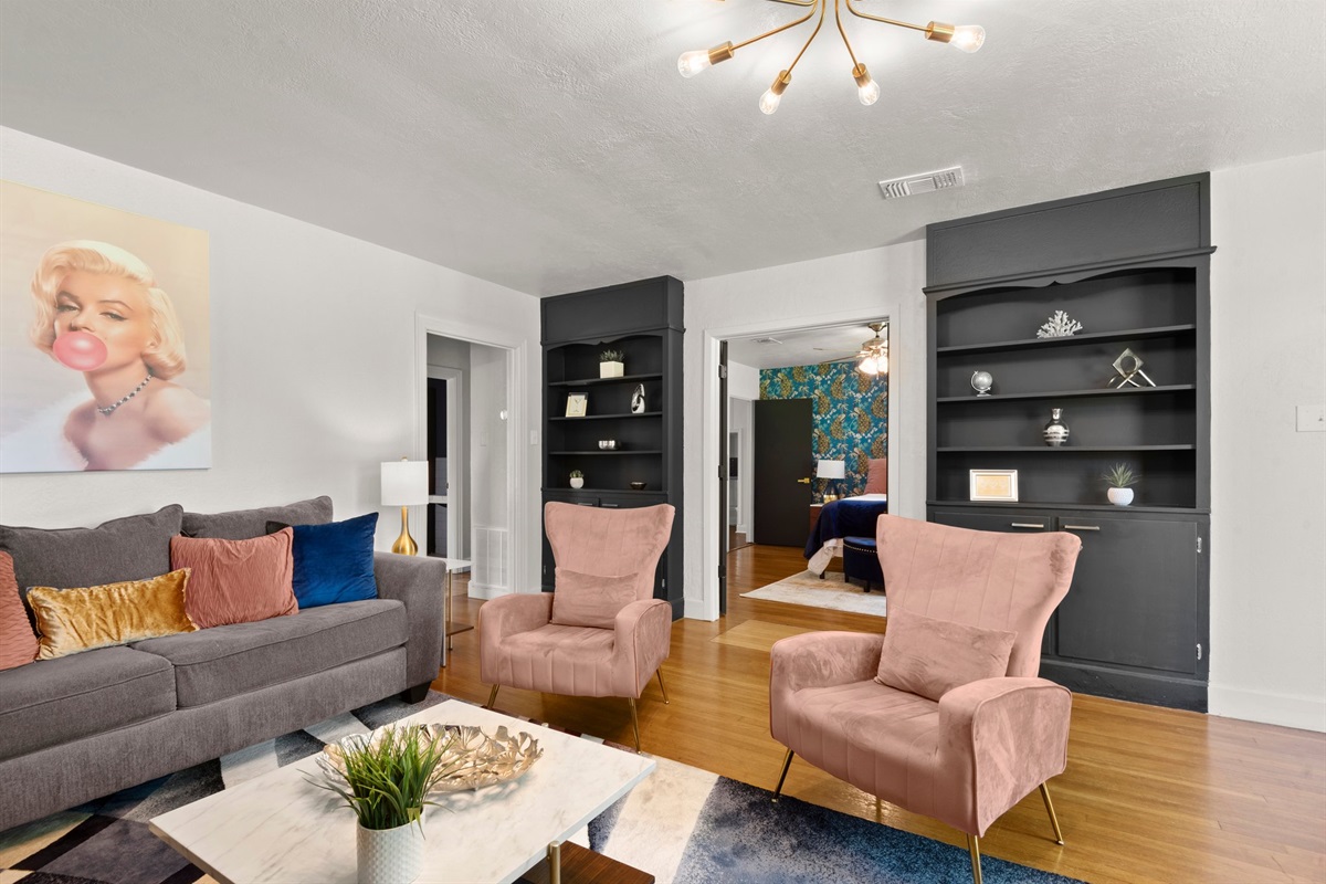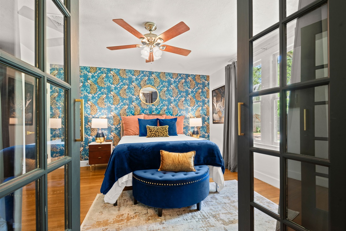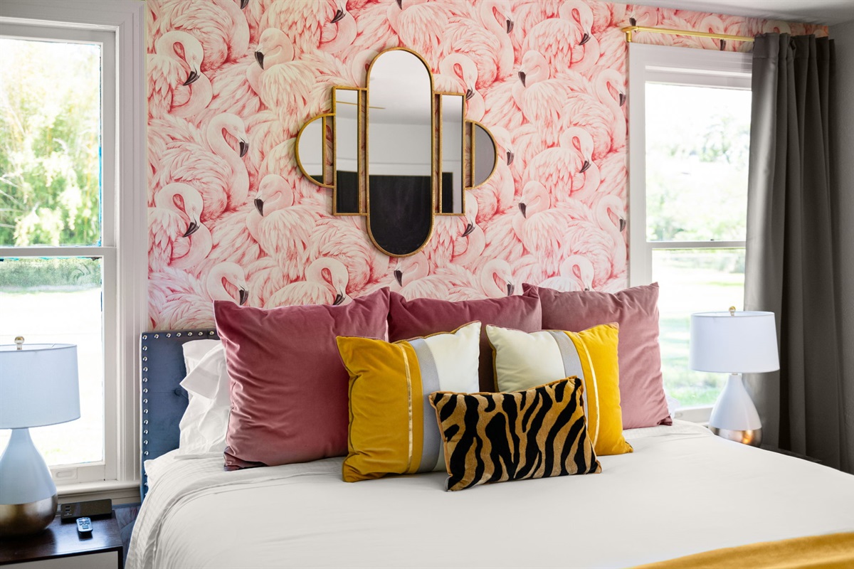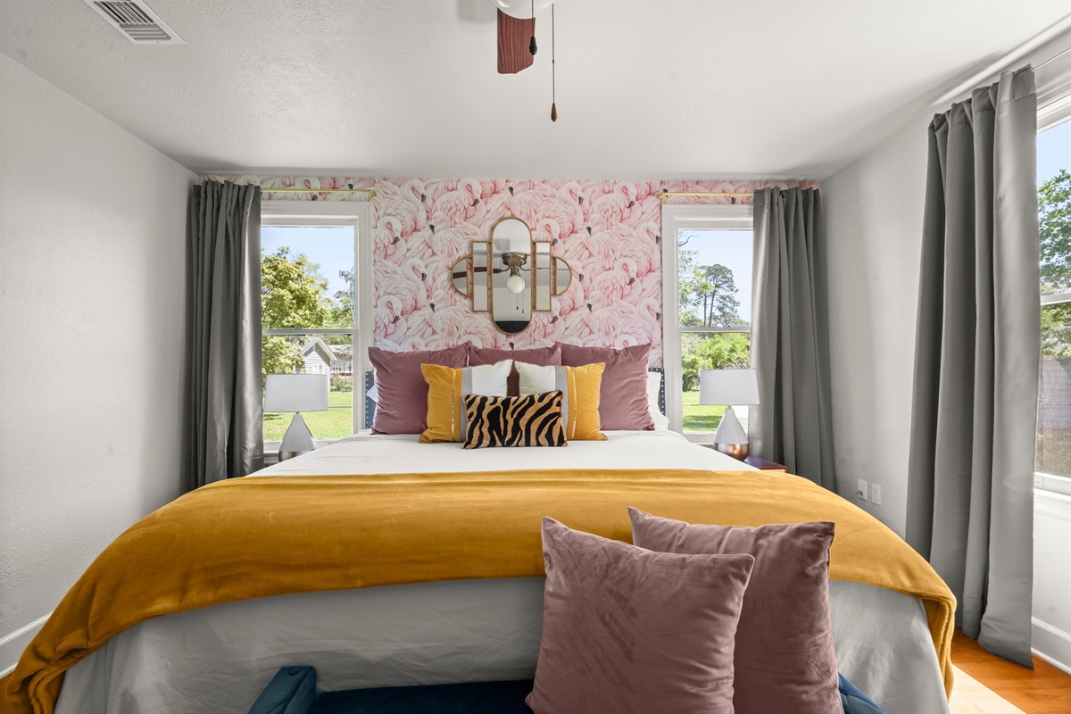 This historic Baton Rouge home has two different mid-century themed designer bedrooms with luxurious gel foam King and Queen beds. All bedrooms have hard wood floors, hotel-quality linens, leafy house plants, and sleek flat-screen TVs. Large windows in all bedrooms allow for plenty of natural light, and small details like a stylish area rug and high-end accents make both spaces feel warm and inviting. Large closets with dressers allow for large hanging and folded wardrobes.