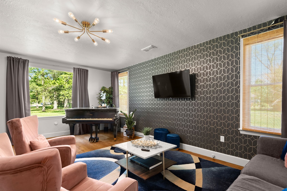 Relax in the spacious living room with designer furniture, chic finishes, and lots of natural light. Settle on the luxurious sofa and read a good book or binge-watch your favorite shows on the 55-inch flat-screen TV. The deep modern armchairs accent chairs, comfy pull-out sofa, brightly colored accent pillows, and baby grand piano create the feeling of being in a classic Baron Rouge concept area.
