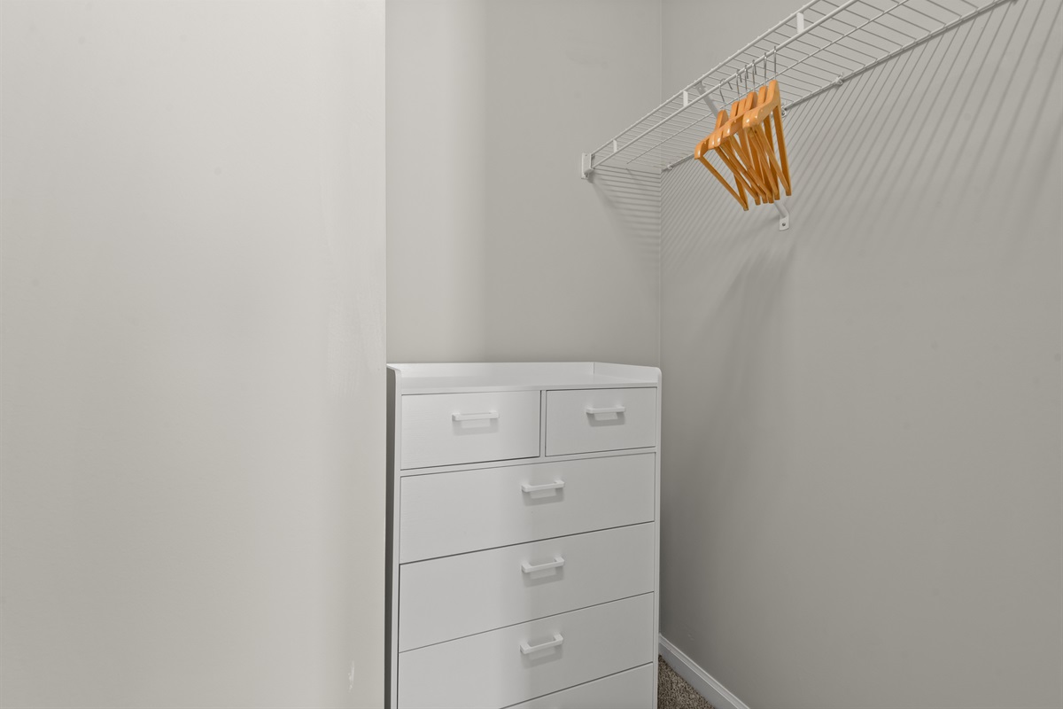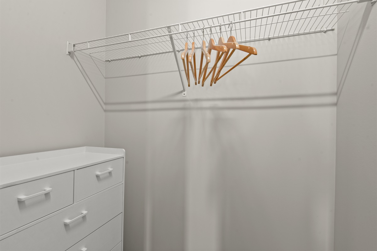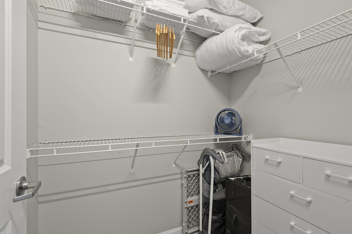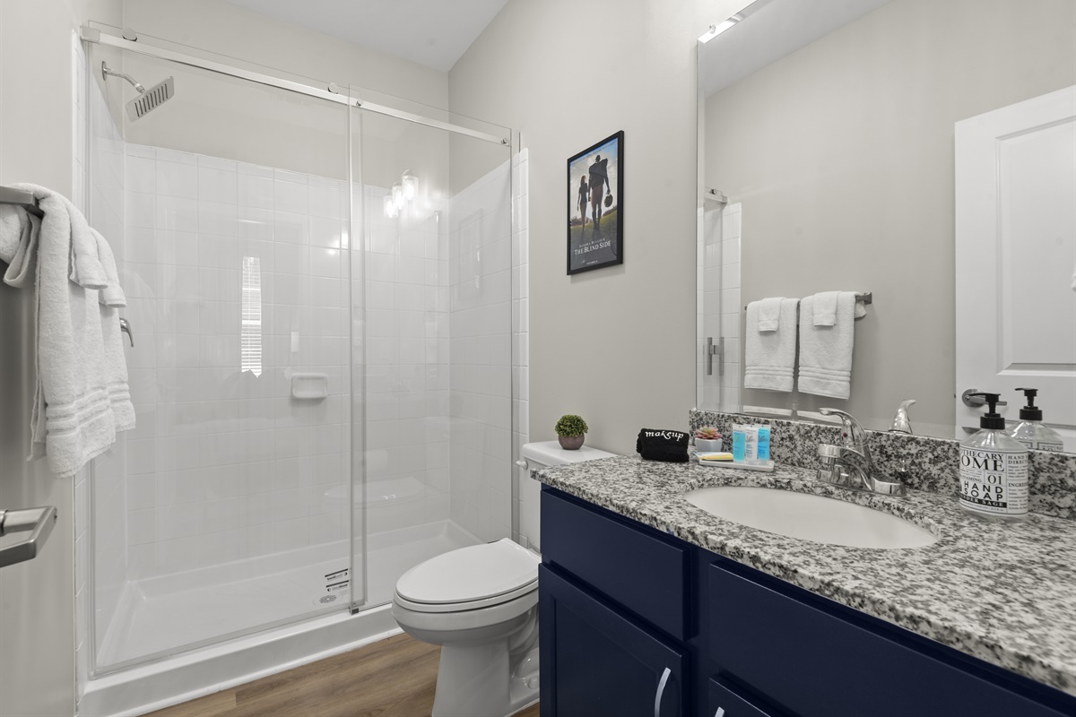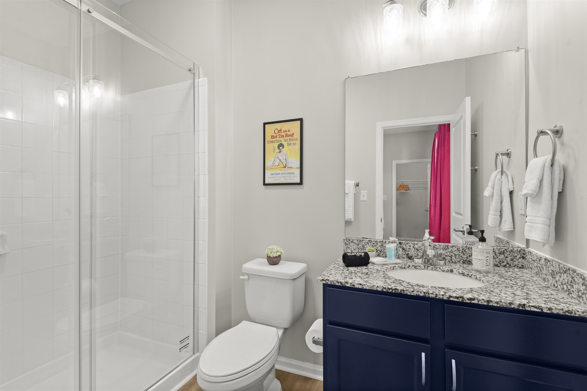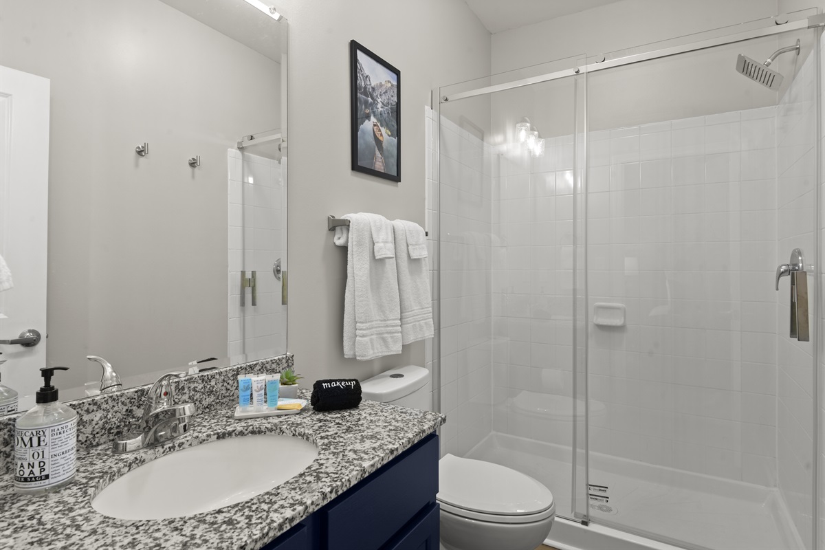 Each bathroom is thoughtfully equipped with plush towels, shampoo, conditioner, body wash, and a hair dryer for your convenience. Experience rejuvenating showers under the rain shower heads, while concealed and hanging storage options cater to your needs. Additionally, a half bath is conveniently situated on the first floor to cater to common areas.