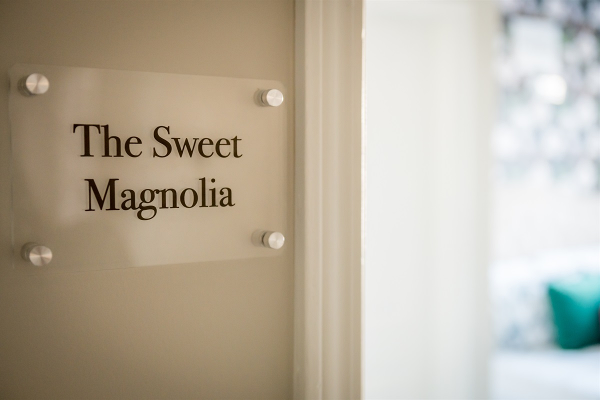 The Sweet Magnolia suite is a delightful haven adorned with floral accents. This room also features a sizable closet and an ensuite bathroom with a walk-in shower.