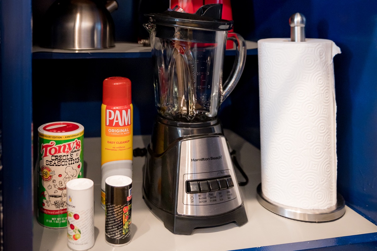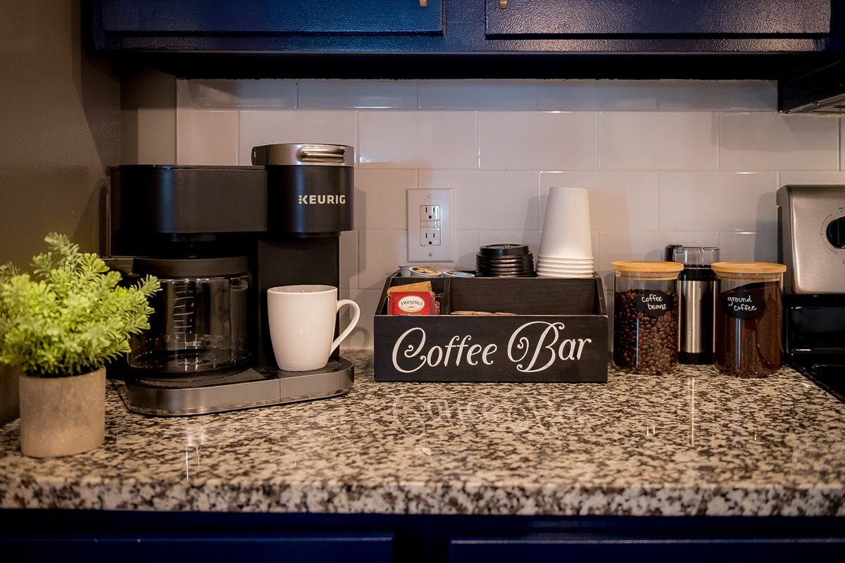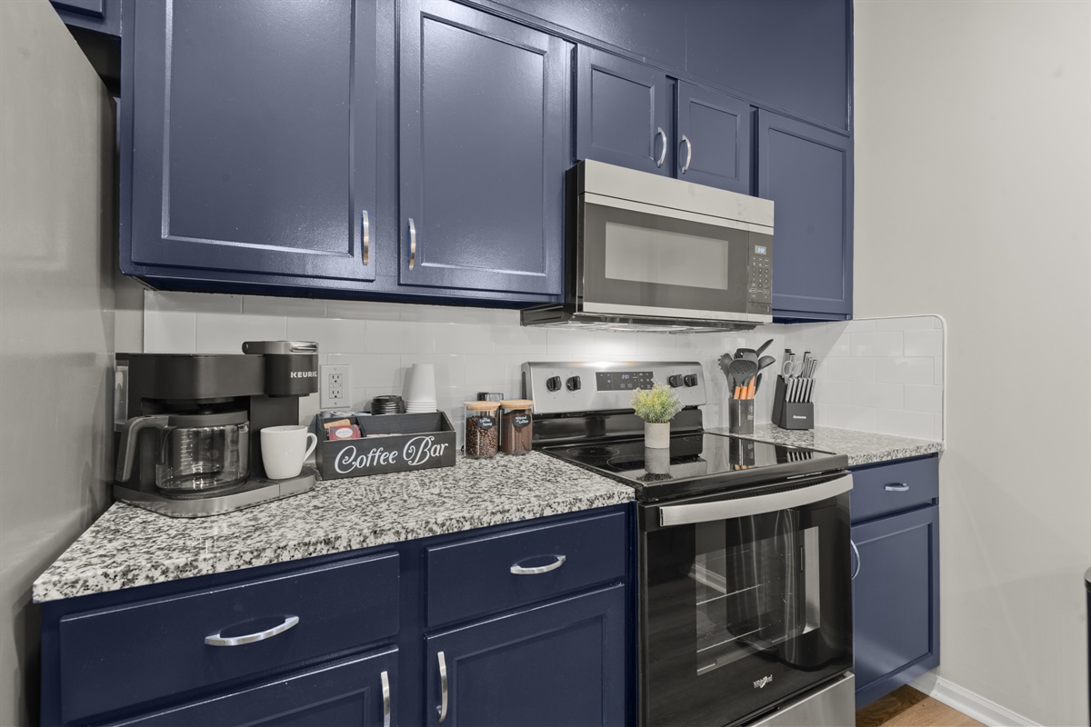 Start your mornings by brewing coffee with the coffee maker and utilize the toaster and blender for quick breakfast preparations. The open layout encourages socializing between the kitchen and lounge spaces.