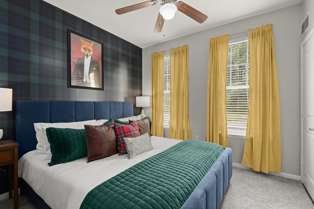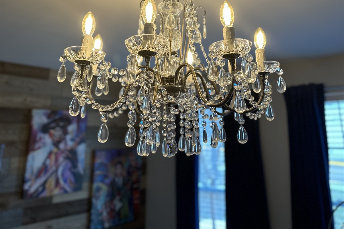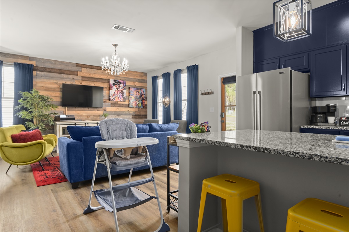 Relax with loved ones in the inviting living room adorned with modern furnishings, Mississippi blues-inspired decor, and abundant natural light. Sink into the plush sofa with a captivating book or indulge in binge-watching on the 55” flat-screen TV. The vibrant yellow armchairs, charcoal rockers, colorful accent pillows, and abstract artwork create an atmosphere reminiscent of Southern sophistication. The living room also doubles as a cozy spot for enjoying provided board games.