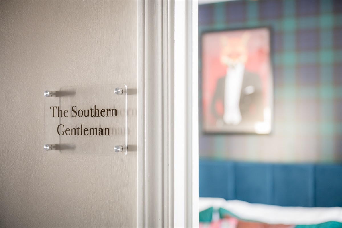 The Southern Gentleman suite exudes charm with its artwork and plaid motif, complete with a private bathroom featuring a walk-in shower.