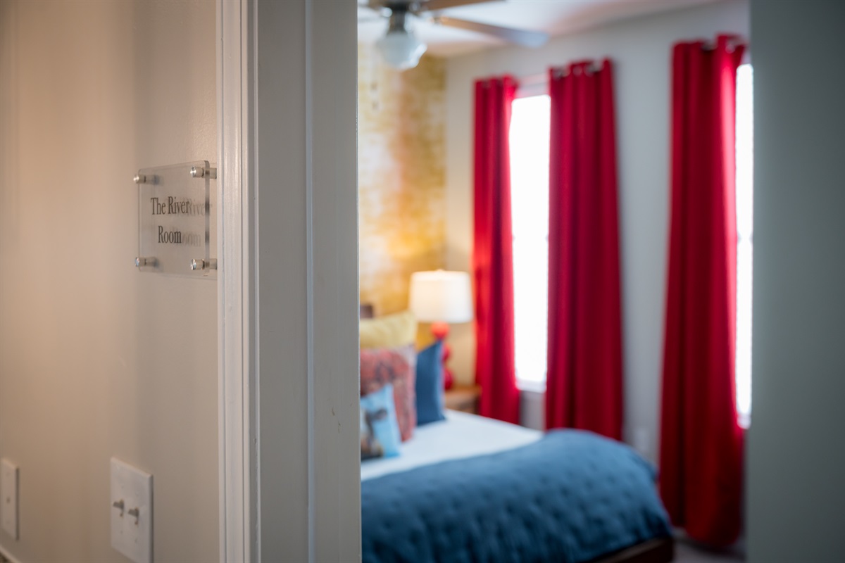 Elevating your experience, there is no designated primary bedroom, as each room is a gem in its own right. Select the theme that resonates with your spirit. The River Room showcases captivating wallpaper adorned with a historical map of the Mississippi River. A walk-in closet offers ample storage, while the ensuite bathroom features a spacious walk-in shower.