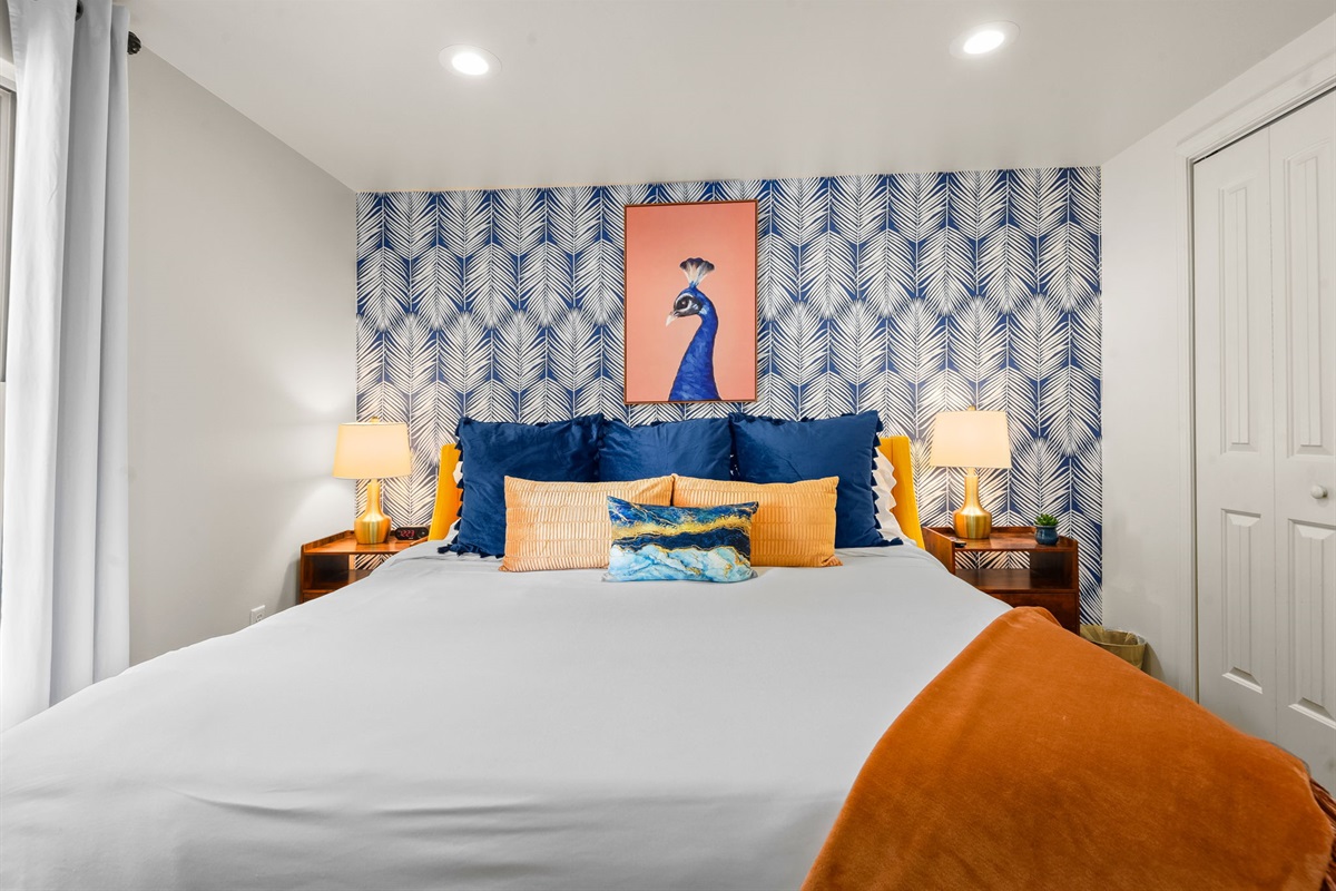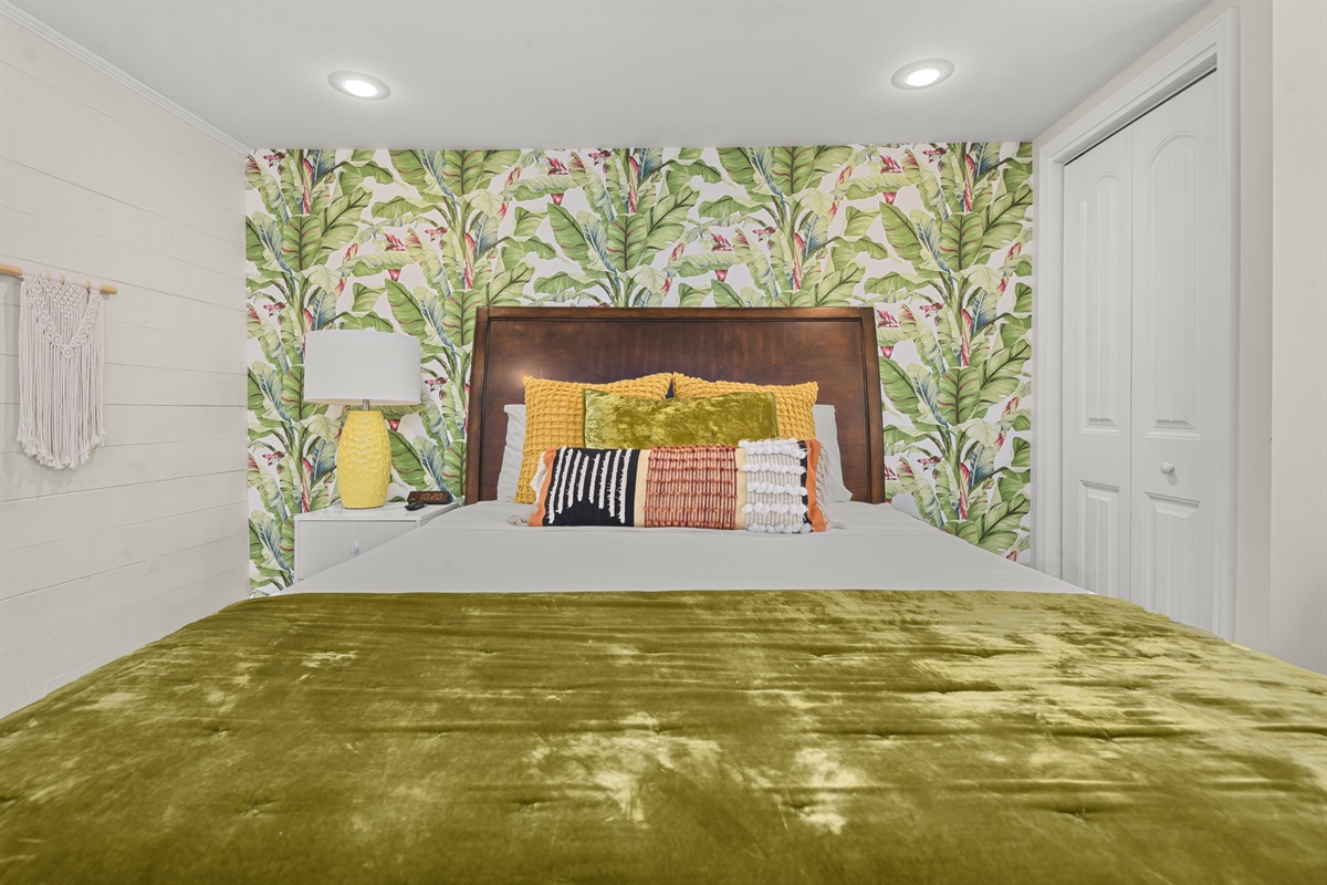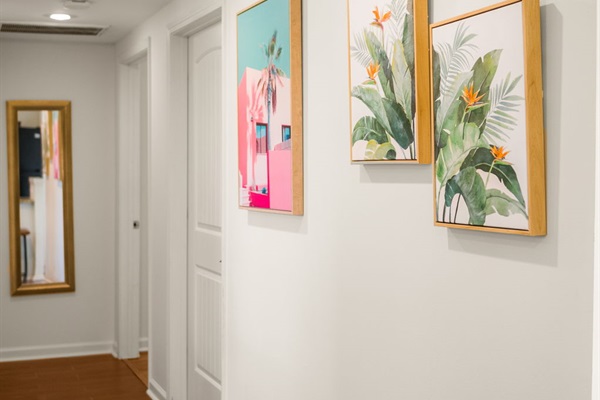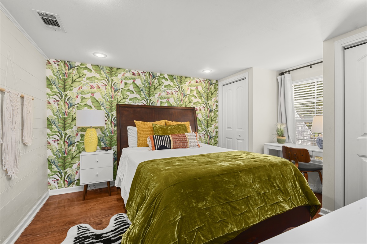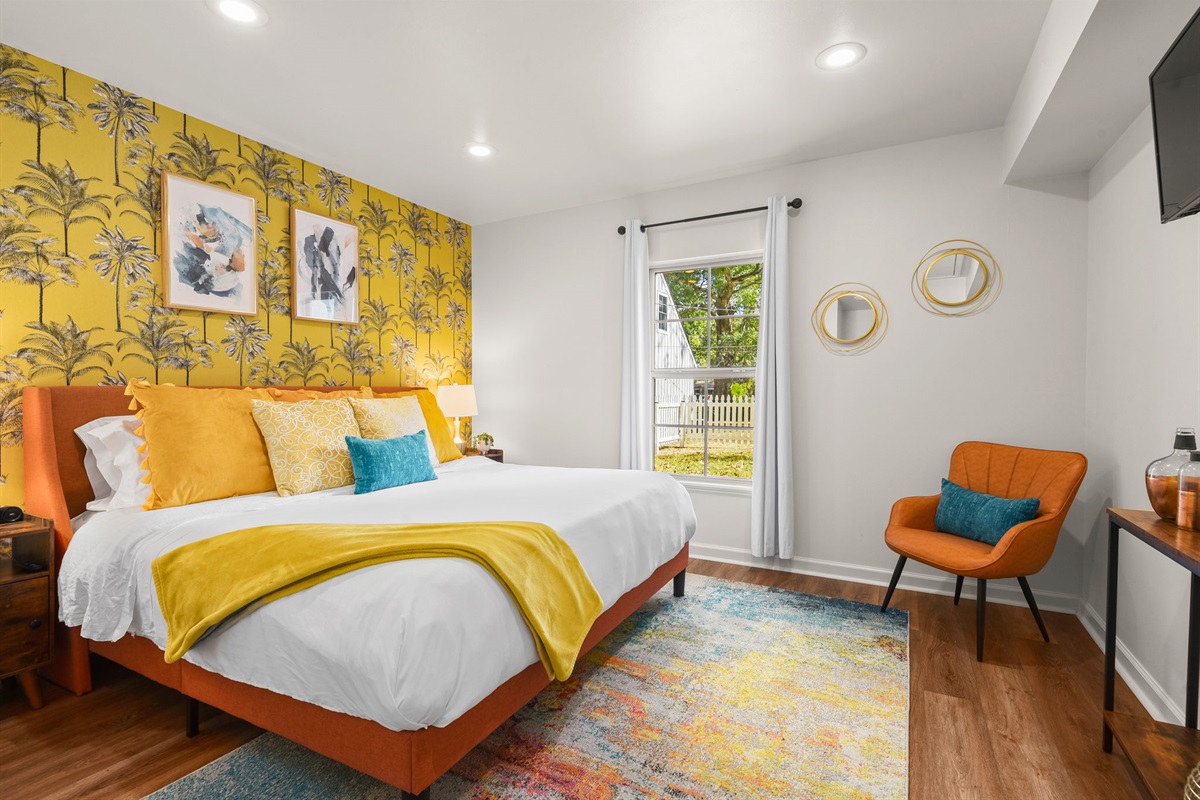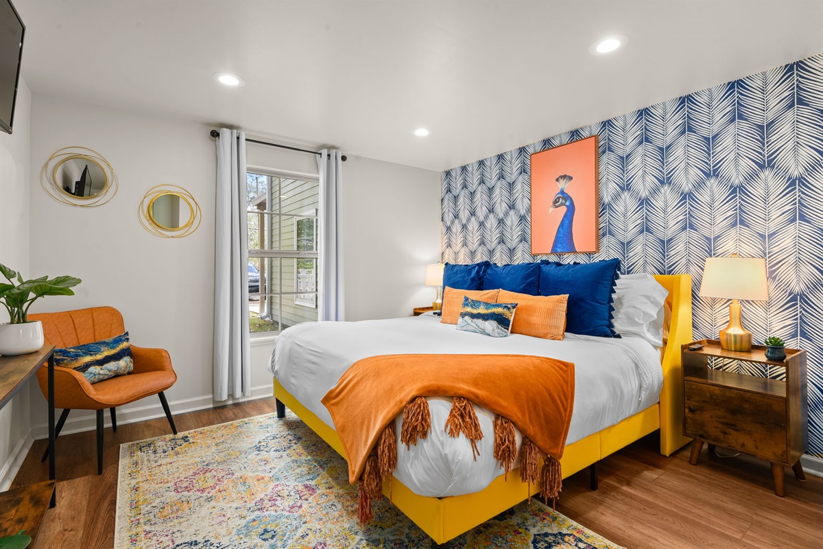 This Baton Rouge home has three designer bedrooms with luxurious King beds. All three bedrooms have gorgeous hardwood floors, hotel-quality linens, leafy house plants, and sleek flat-screen TVs. Large windows in each bedroom allow for plenty of natural light, and small details like a stylish area rug and nature-themed accents make both spaces feel warm and inviting.