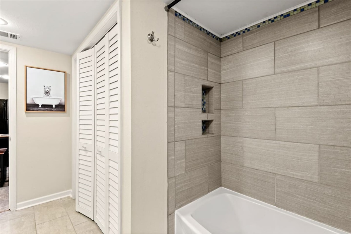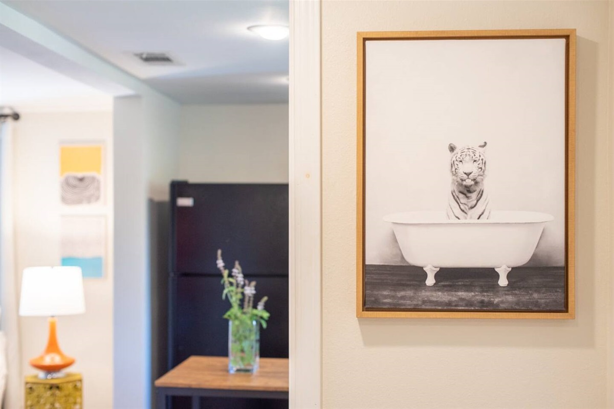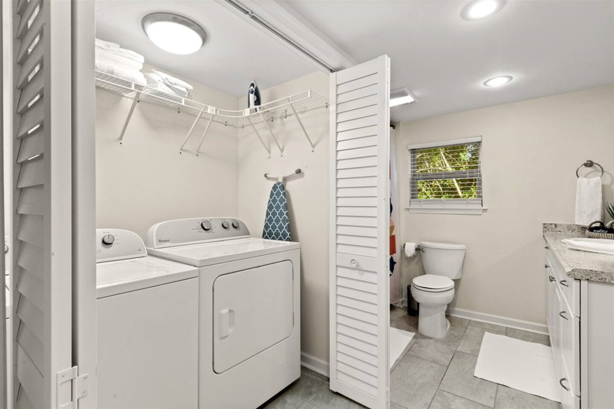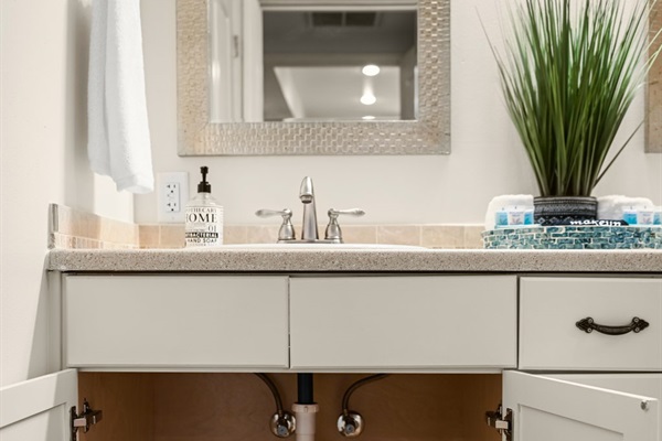 This stylish home has two full bathrooms with a tub/shower combo, mirrored vanity, plenty of hidden storage, and stunning finishes. Spend all day exploring Baton Rouge, and then come home and enjoy a long, hot shower before settling in for the night. The water pressure is excellent, towels are soft, and bathroom basics (like make-up remover and hand soaps) are included.