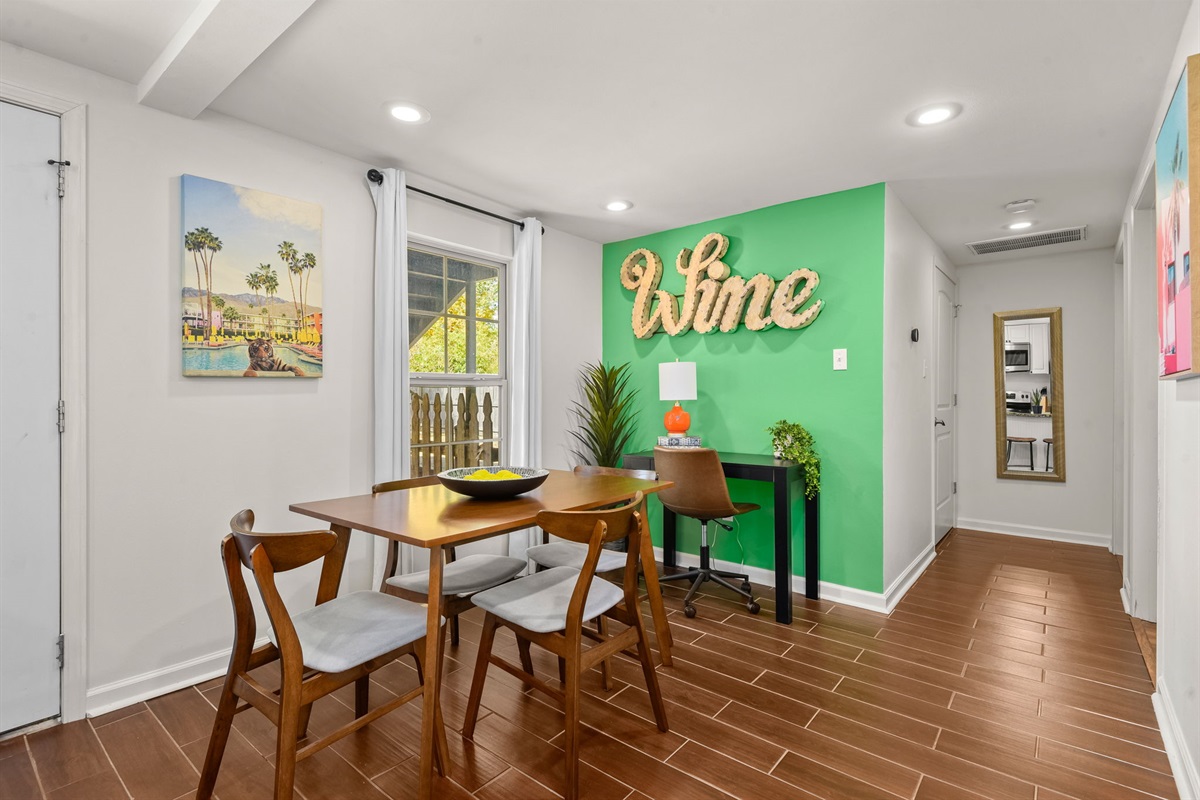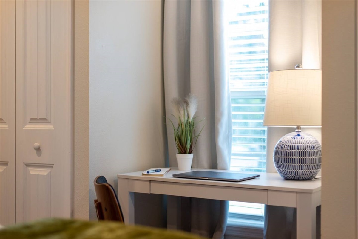 Need more space to work? A dedicated desk in the dining room invites you to set up all of your electronics, charge your devices, and even print if you need to.