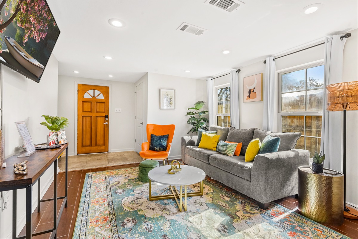 - Large living room; colorful designer furnishings, 50" Roku Smart TV