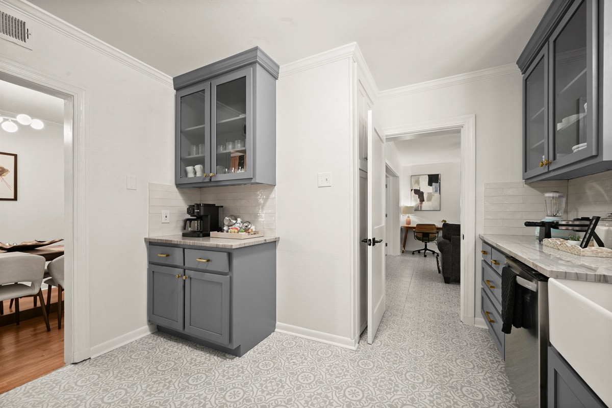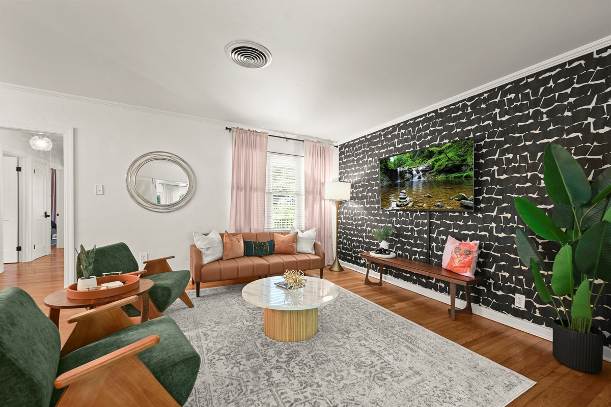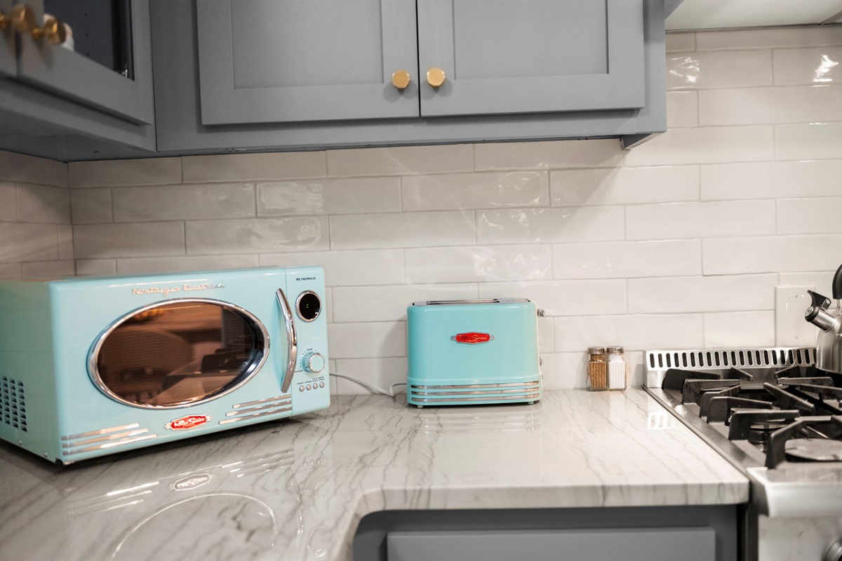 The stylish yet functional kitchen features a spacious layout with custom cabinetry, granite countertops, and charming retro appliances. Start your day with a fresh waffle and a coffee in the cozy breakfast nook. Whether creating delicious meals that rival the best restaurants or preparing a quick snack, the elegant dining room is the perfect spot for your whole group to gather.