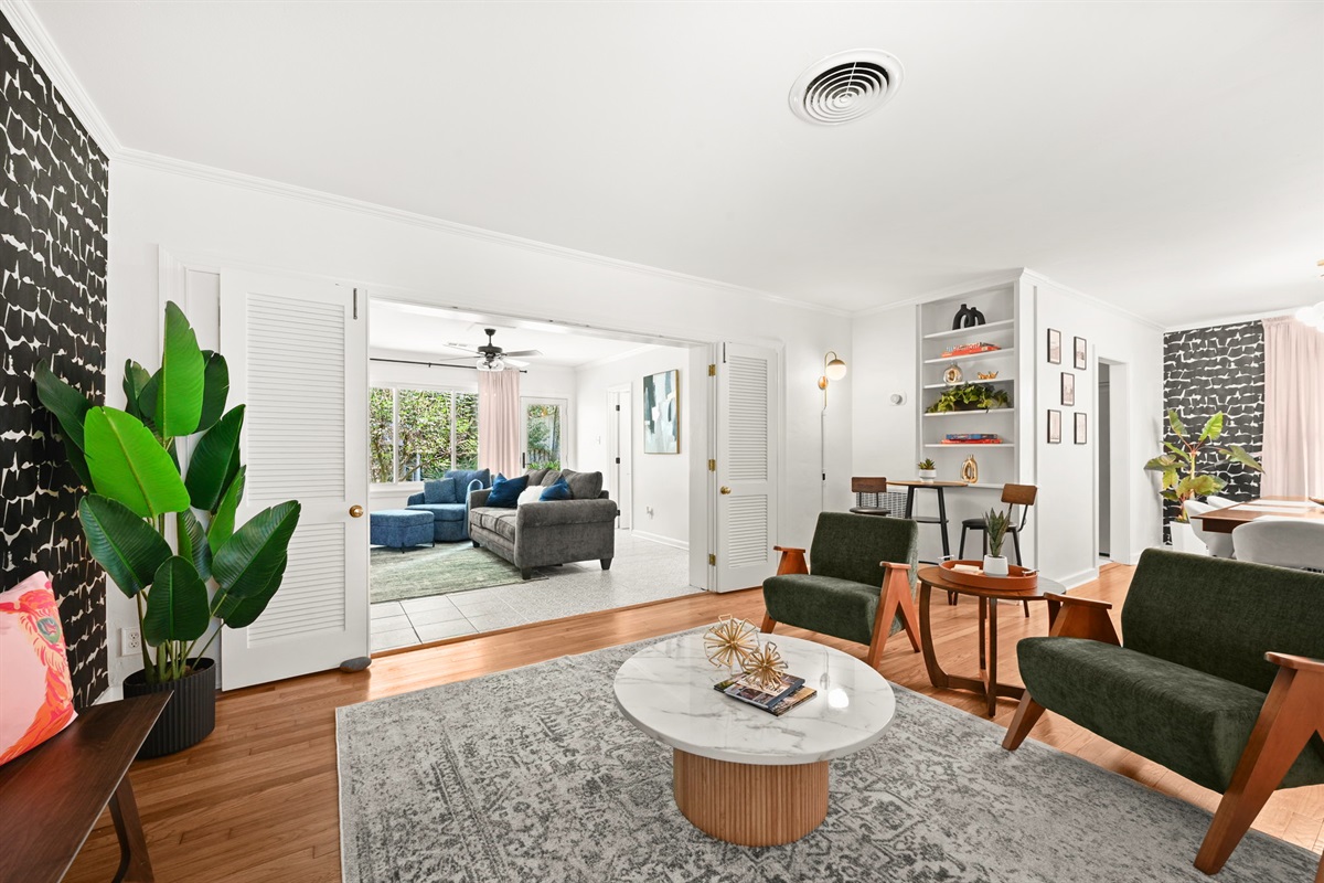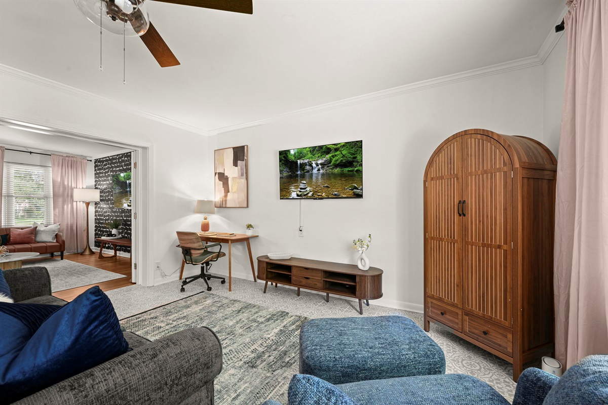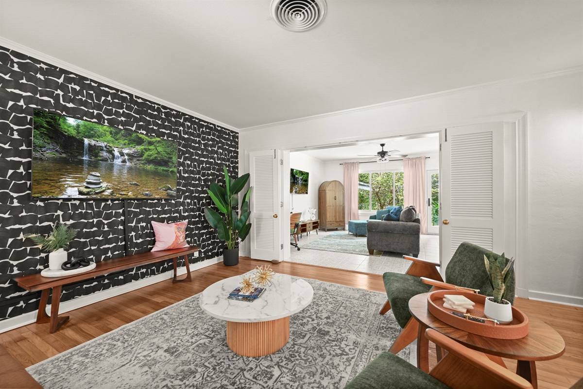 This spacious home boasts two bright living rooms connected by stylish French doors. Cheer for your favorite team from the comfort of the plush couch, relax with an intriguing mystery novel, or simply enjoy quality time with your companions while soaking up the cozy ambiance created by the chic decor. A stylish desk and chair offer a convenient spot to check emails or get some other work done.