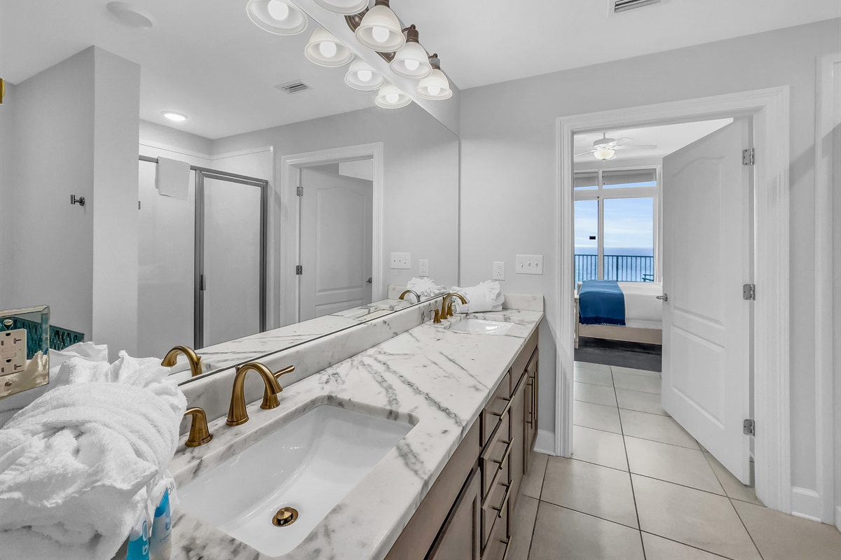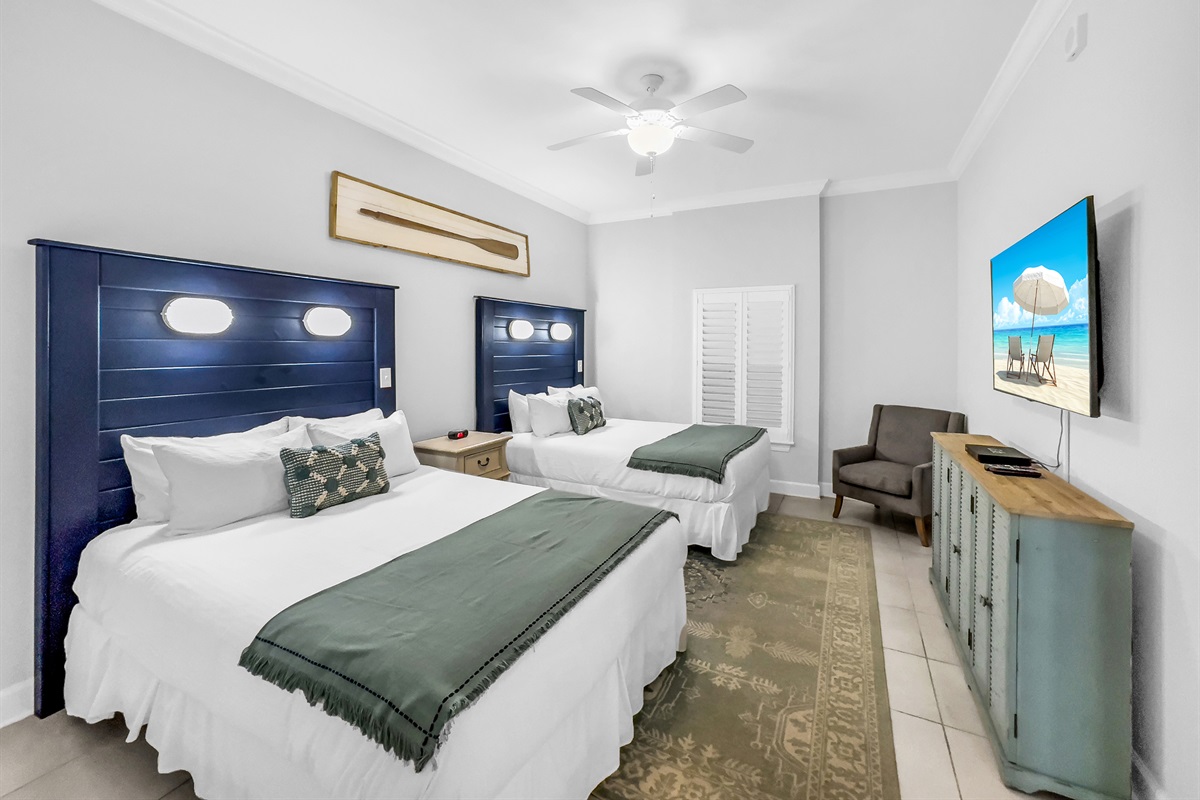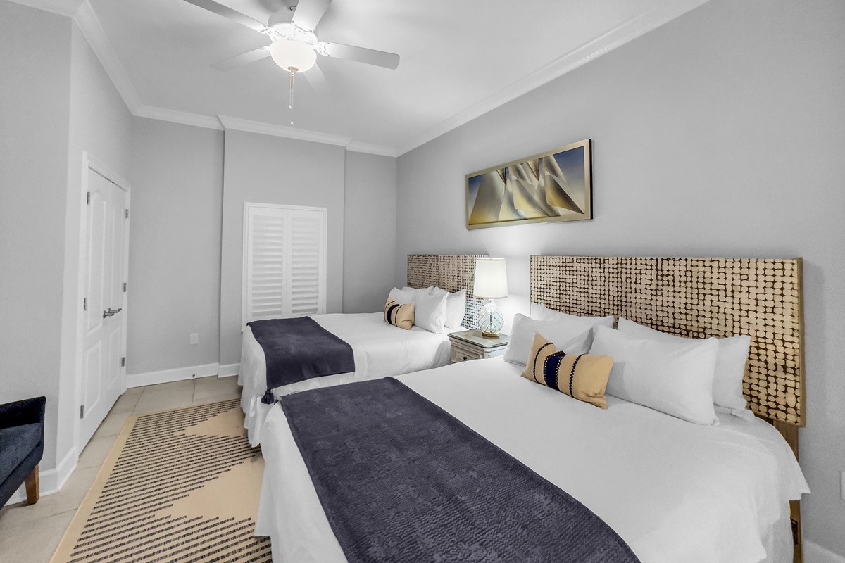 Discover the epitome of relaxation with balcony access not only from the living area but also from the master suite, offering panoramic views and a serene ambiance. Situated just beyond the entry, the guest bedroom offers 2 queen beds, perfect for families or groups seeking a restful retreat. Across from it, are another 2 queen beds providing additional comfort, ensuring everyone has a relaxing stay.