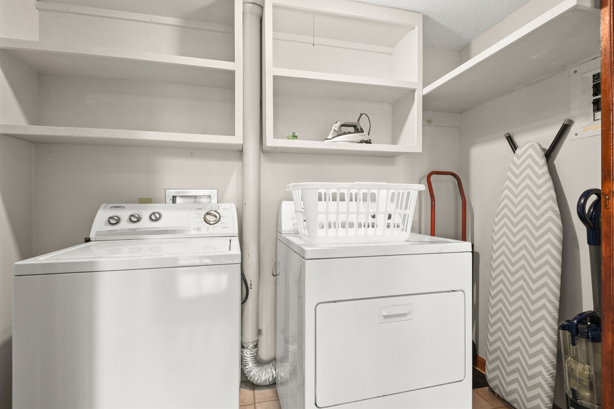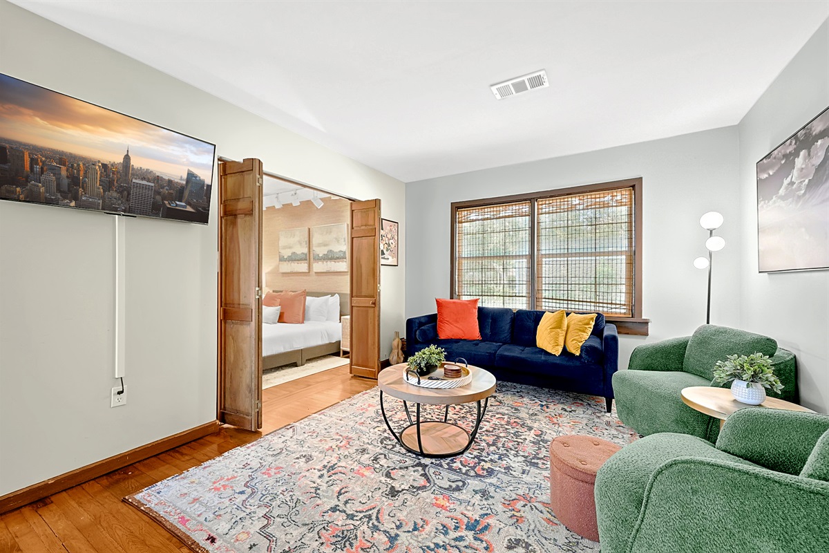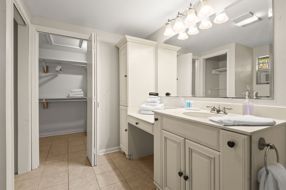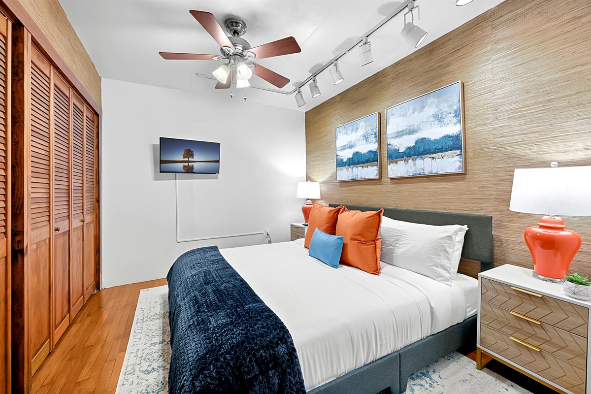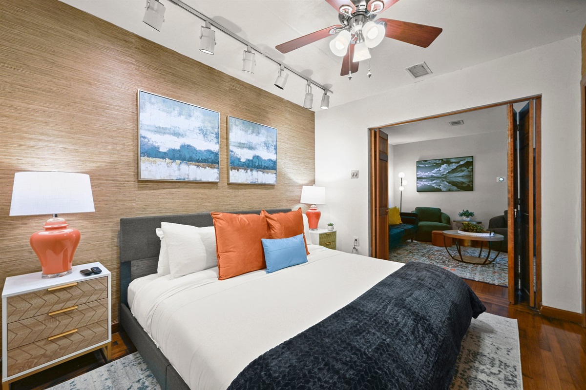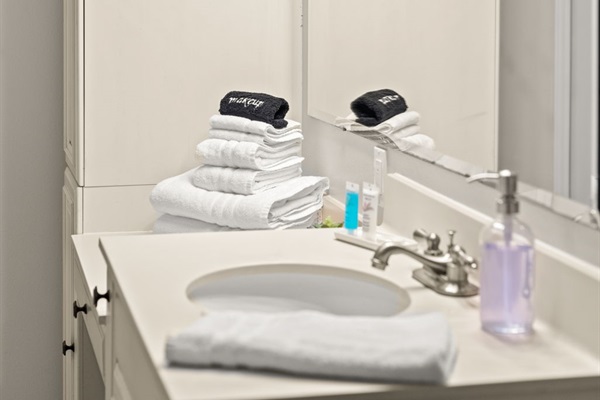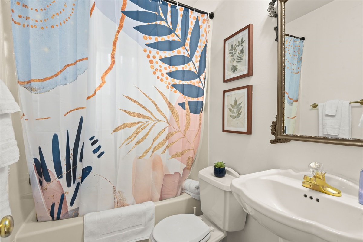 The large primary ensuite bathroom features all the comforts of home, including a newly renovated tub and shower. The large primary bathroom closet and plenty of storage make for convenient use of space for longer stays. Bathroom 2 is located between the guest bedrooms and offers a full shower and tub, perfect for unwinding after a day exploring the vibrant city.
